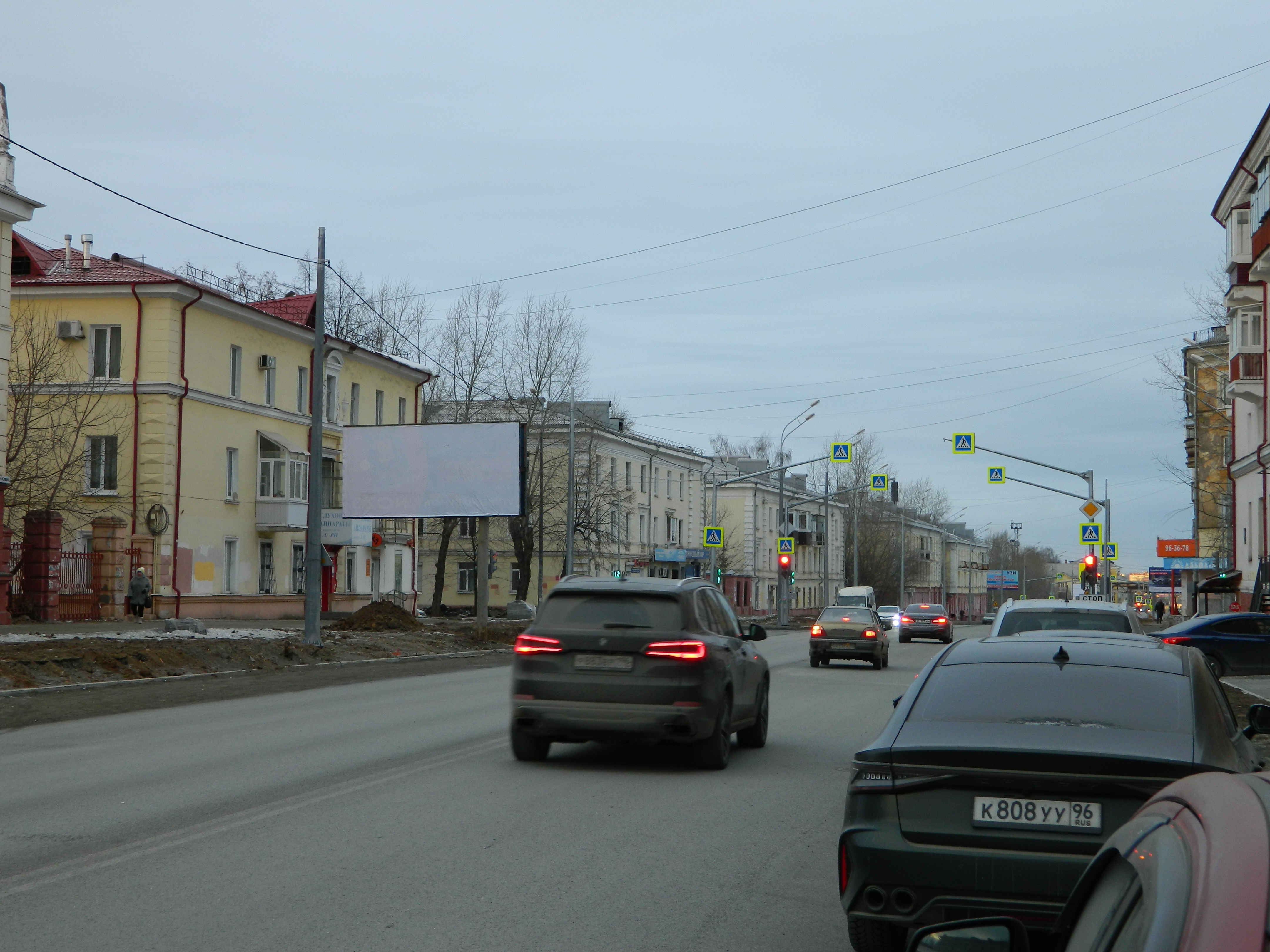 Щит расположен на перекрестке двух улиц в центре деловой активности города. Хорошо просматривается во время ожидания сигнала светофора. Направление движения транспорта с вокзала на Тагилстрой, Выю, Красный Камень. Рядом расположены магазин "Красное и белое", ортопедический салон, стоматологический центр. Высокий автомобильный и пешеходный трафик.