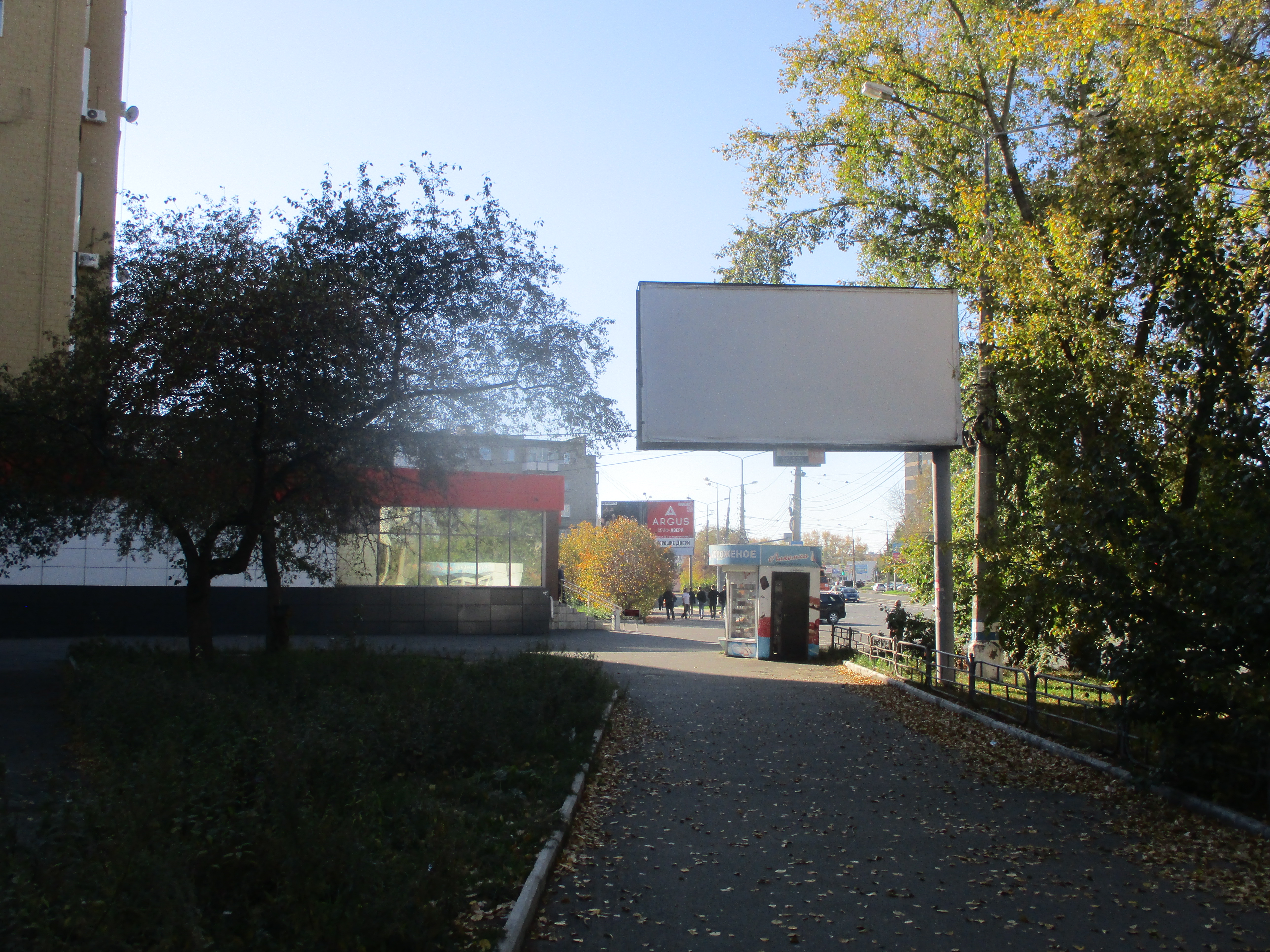 Щит расположен на парковке у супермаркета "Кировский". Хорошо просматривается во время ожидания сигнала светофора. Рядом расположен универсам "Магнит", магазин "DNS". Напротив находится здание УВД Ленинского района, УВД Пригородного района. Направление движения транспорта в сторону районов центр города и ГГМ. Высокий пешеходный трафик.