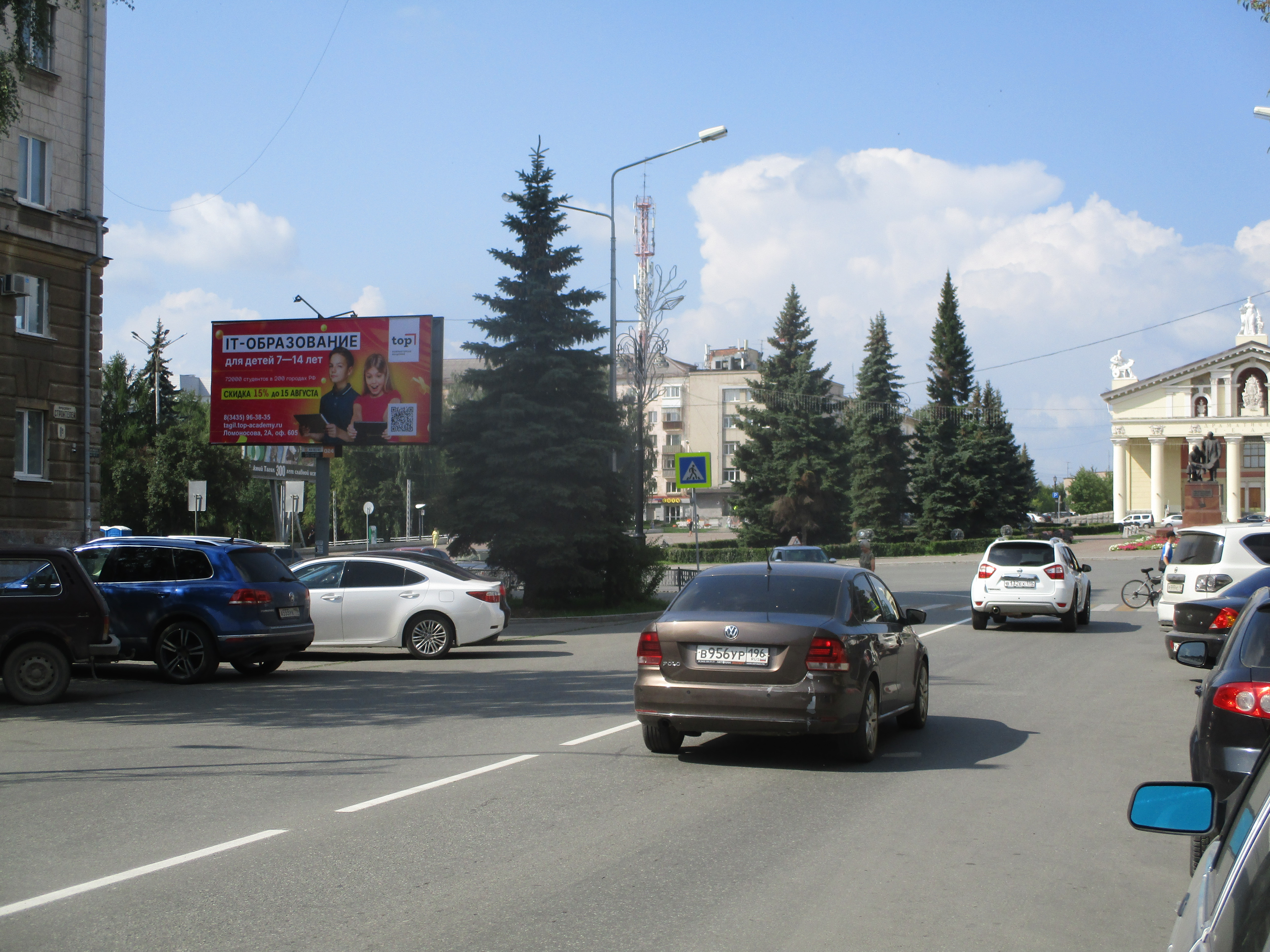 Щит расположен в центре деловой активности города на перекрестке двух проспектов, у Центральной Библиотеки. Рядом находятся Администрация города, Драматический театр, Центральная библиотека, офисы операторов связи "Билайн", "МТС", "Сбербанк".Направление движения транспорта в сторону Драматического театра и Администрации города. Высокий автомобильный и пешеходный трафик.